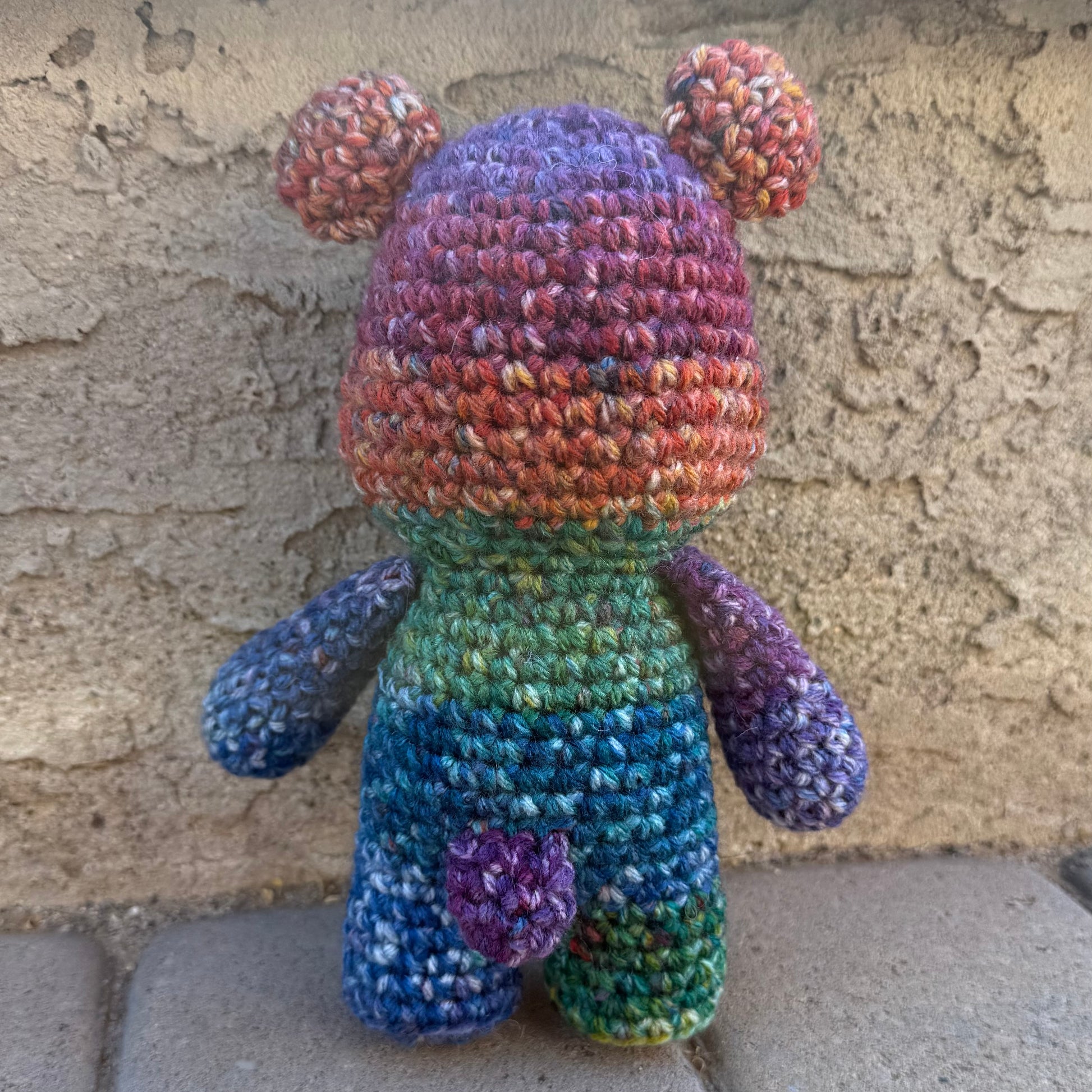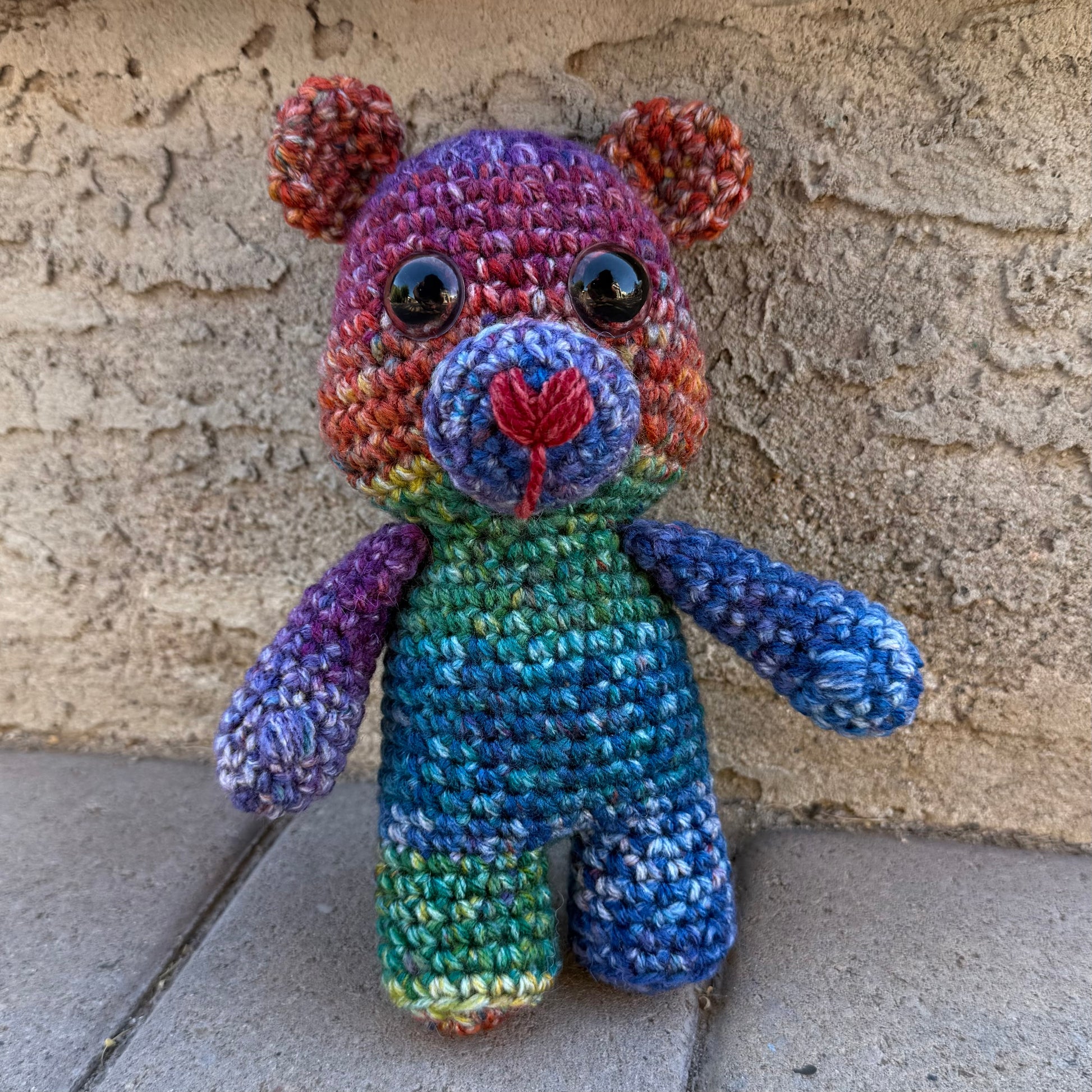 This is the Crayon Box Bear. Crocheted in vibrant rainbow yarn, it’s colorful, cheerful, and one of a kind. About 8.5 inches tall, it’s the perfect size to brighten a shelf, a bed, or your room. There’s only one for now, but no bear is the same.