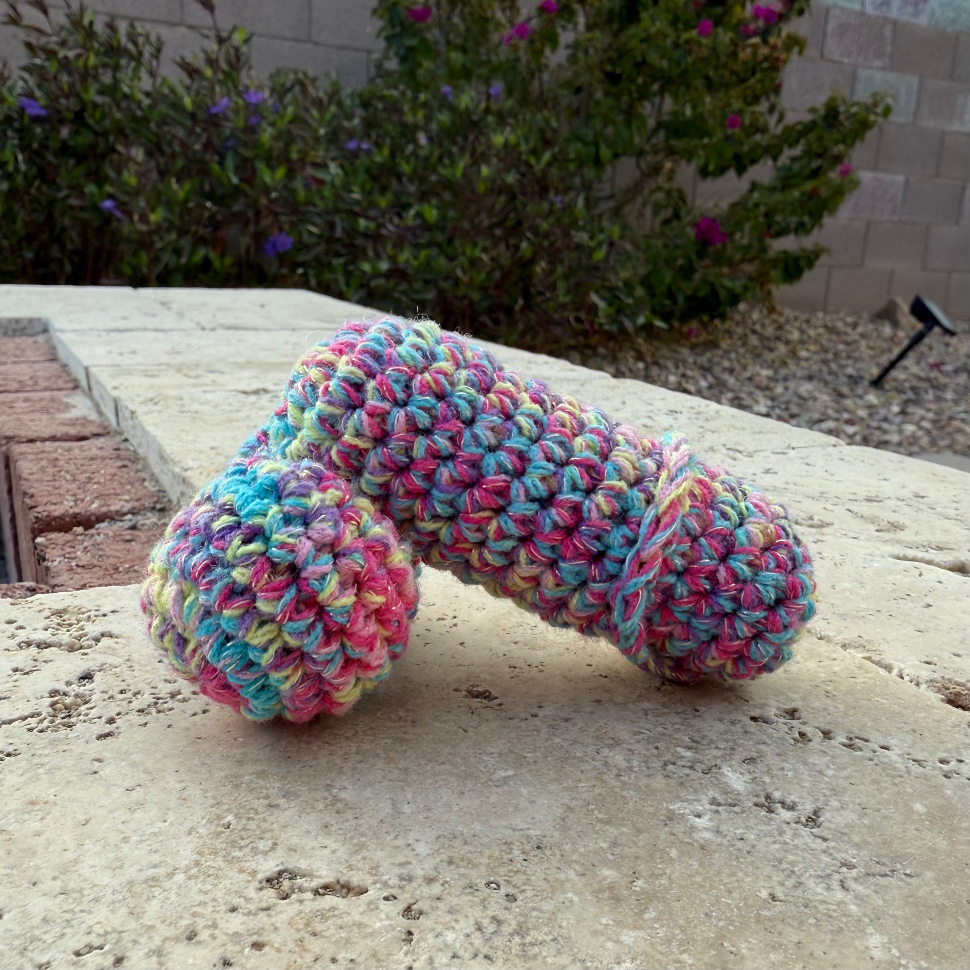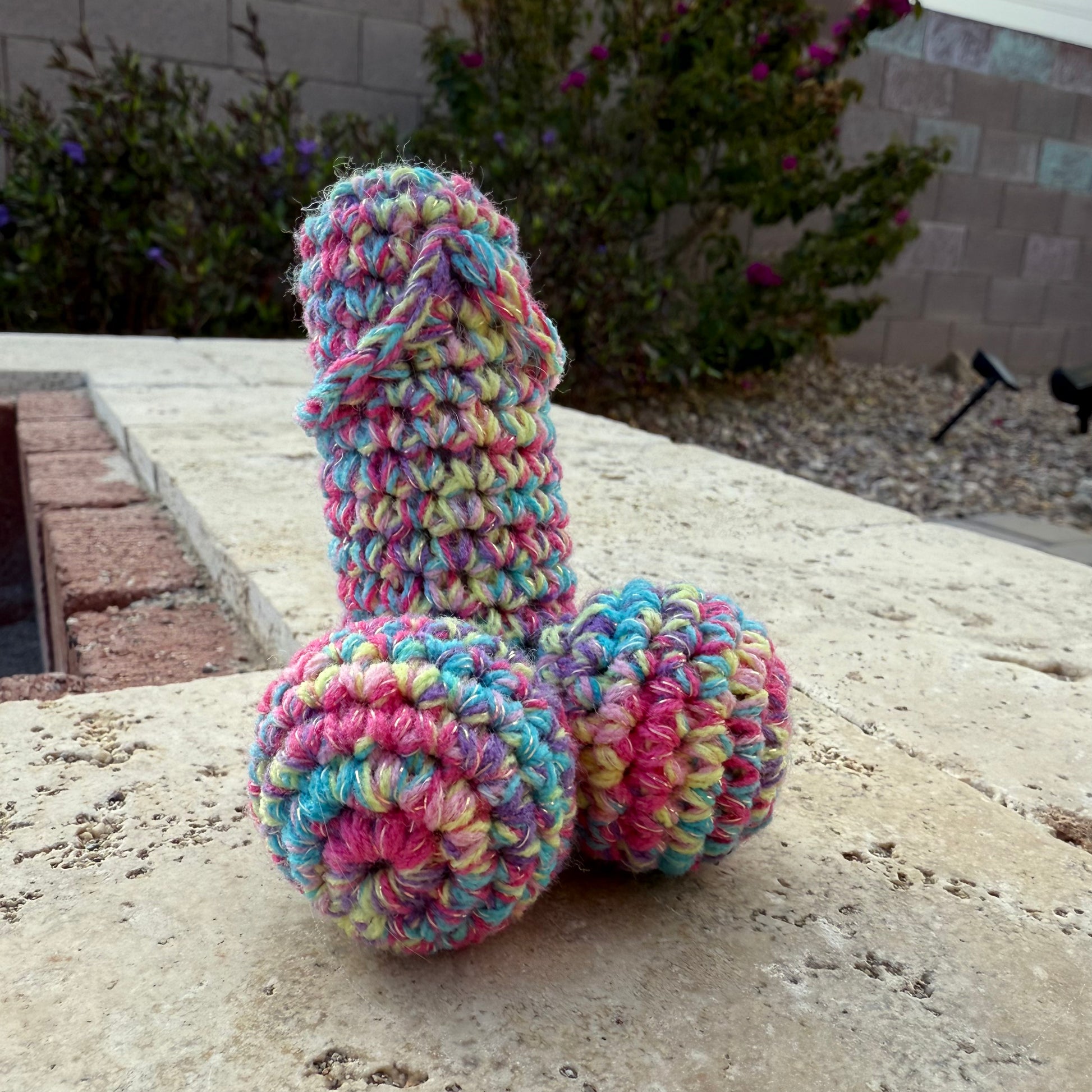 Need a little pick-me-up? Meet our Emotional Support Peen! This cute rainbow weenie is the perfect size for your pocket, and guaranteed to bring a smile when squeezed. Hand-crocheted by Mike, it's the quirky companion you never knew you needed.