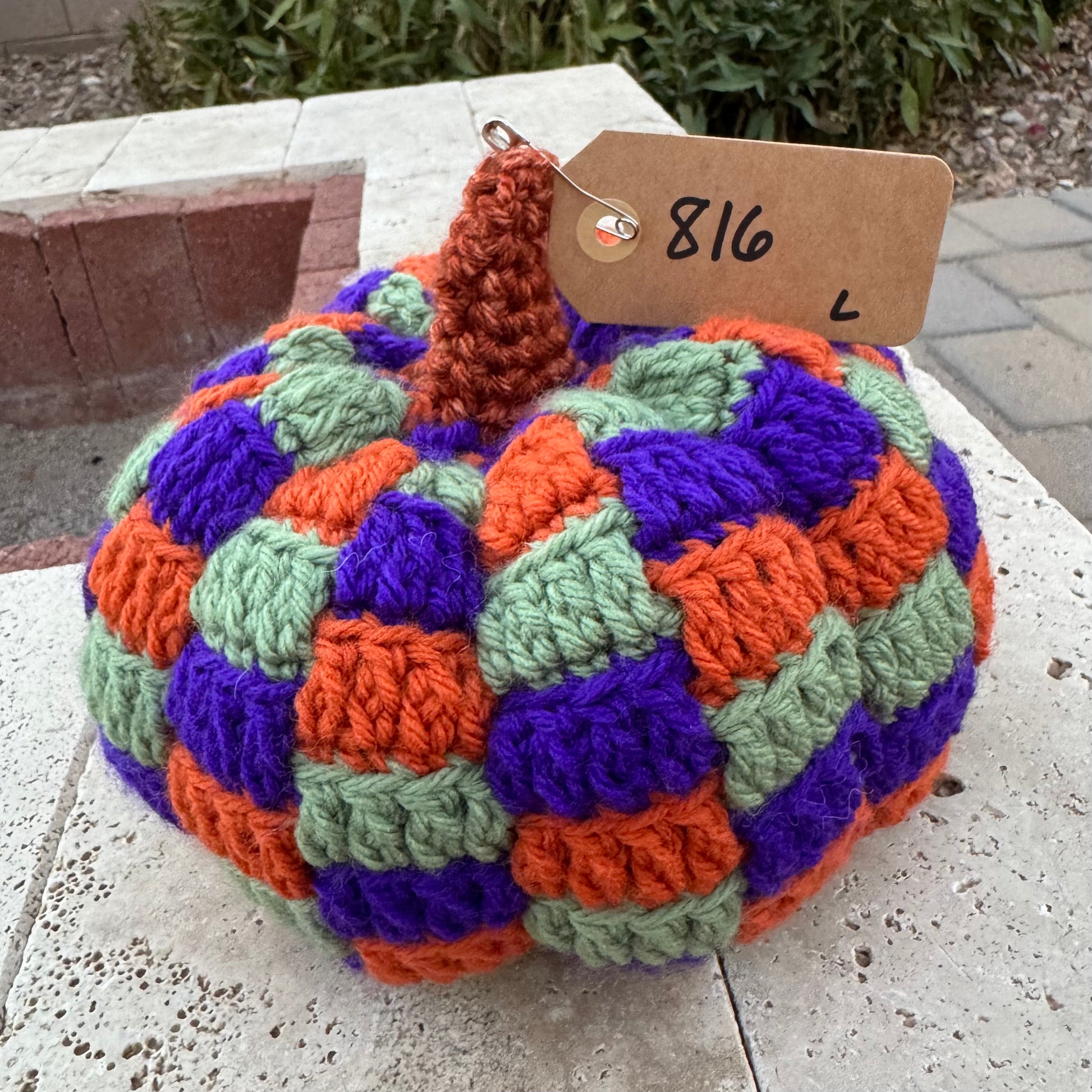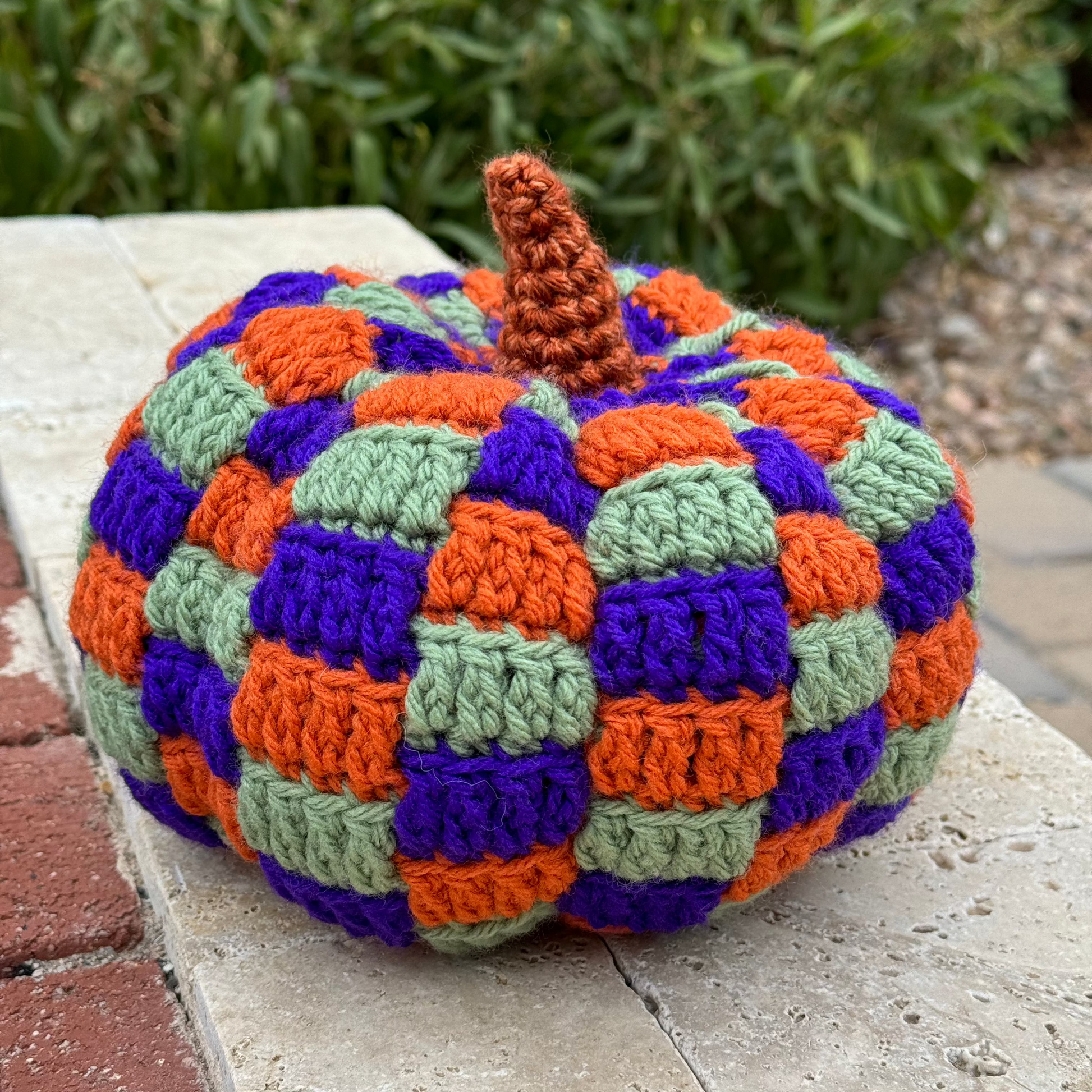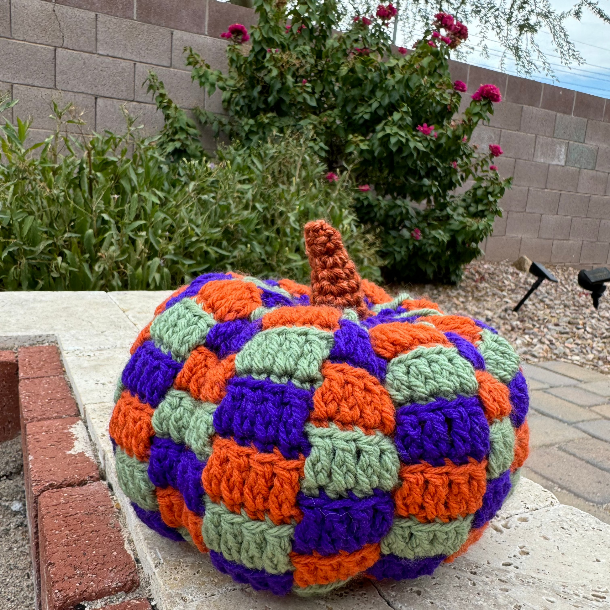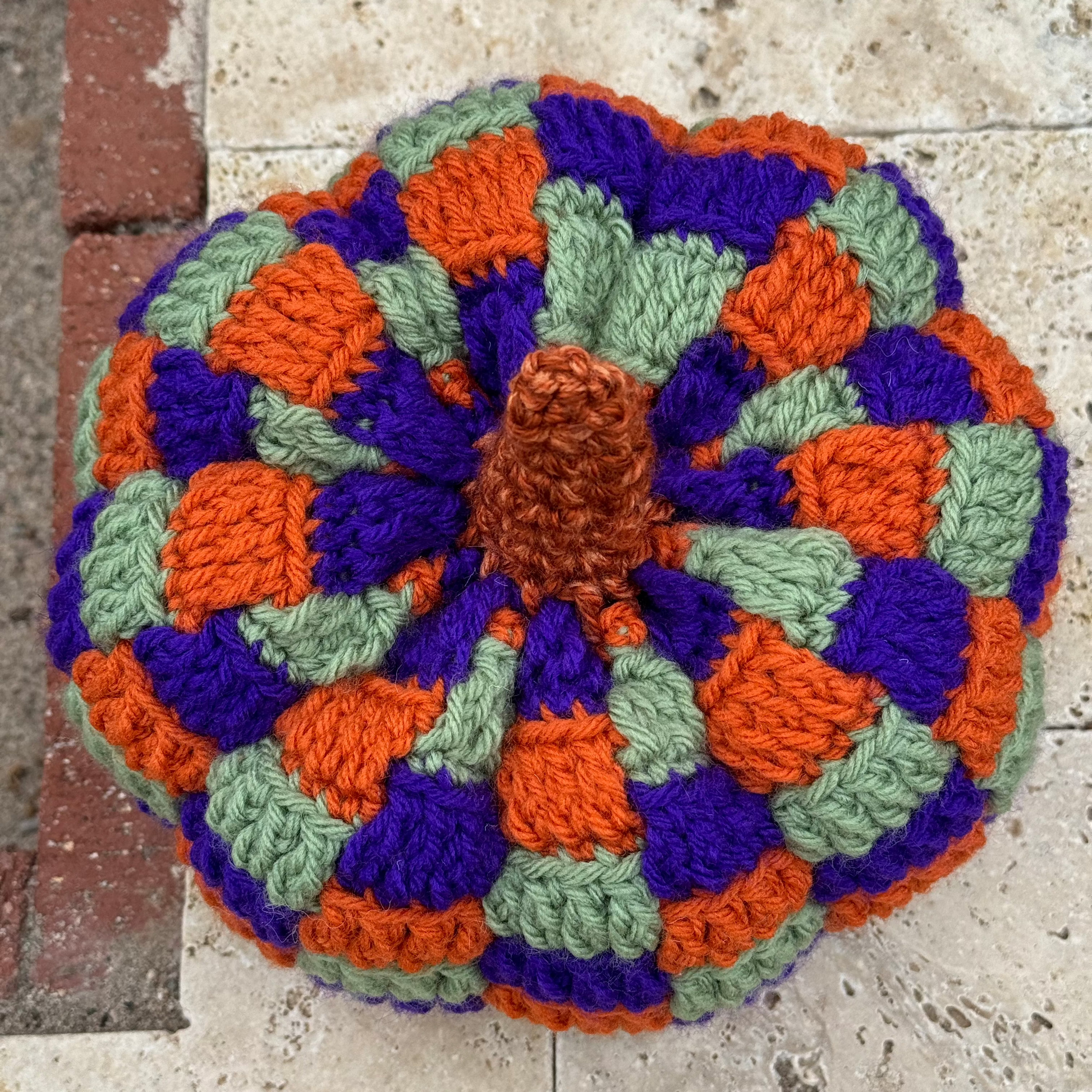 Mike really leveled up his pumpkin game this year. These are double if not triple the work. Small yarn means tiny stitches. They take a few days to create. This color palette was inspired by Hocus Pocus. The colors match Winnie's dress, and hair.