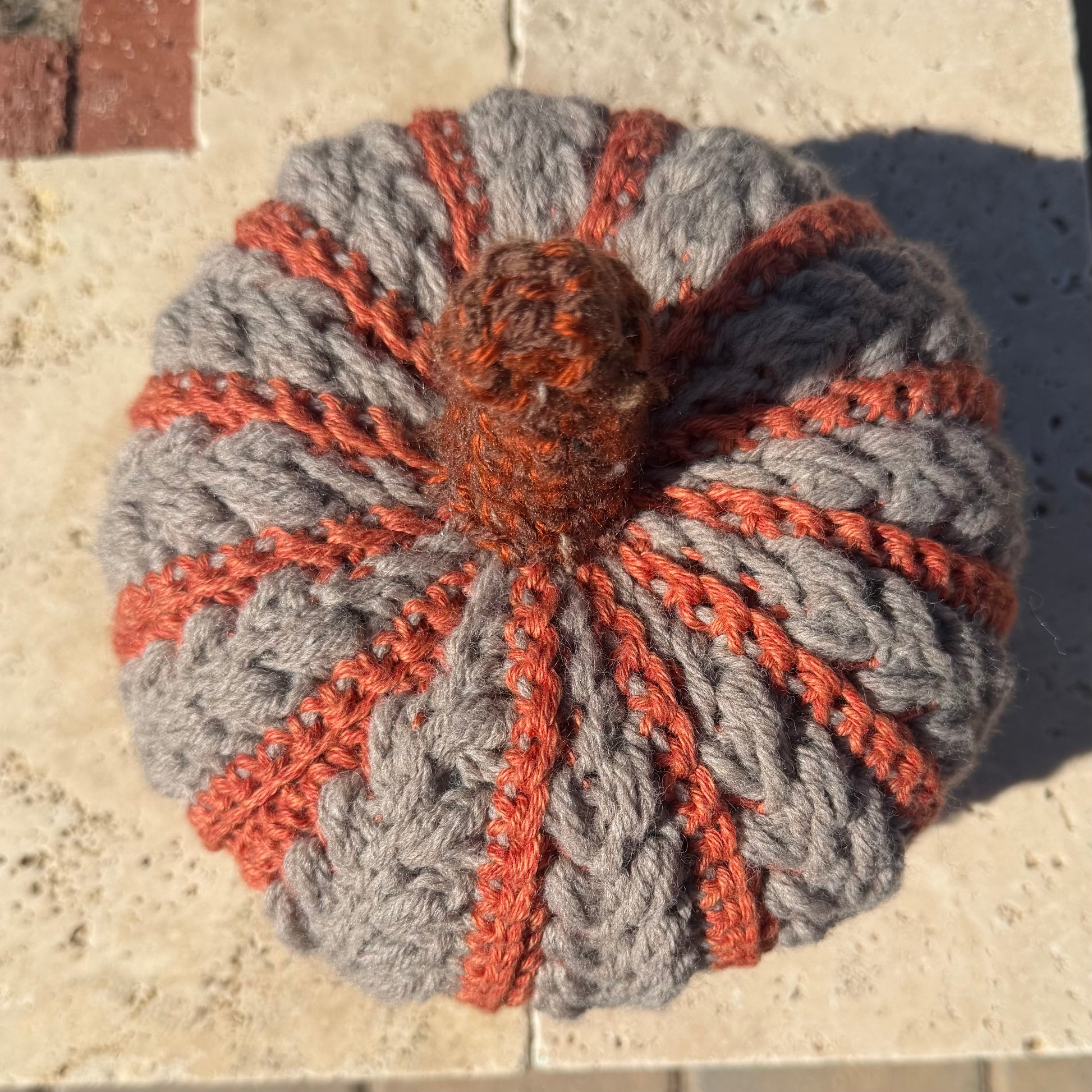 These beautiful wheat stitch pumpkins are Mike's new 2025 creation. They are crocheted with multiple strands of yarn at once, and the wheat stitch pattern almost make it look like it's braided. We sell pumpkins 365 days a year, because at Harrizona Dream... Halloween Never Ends!