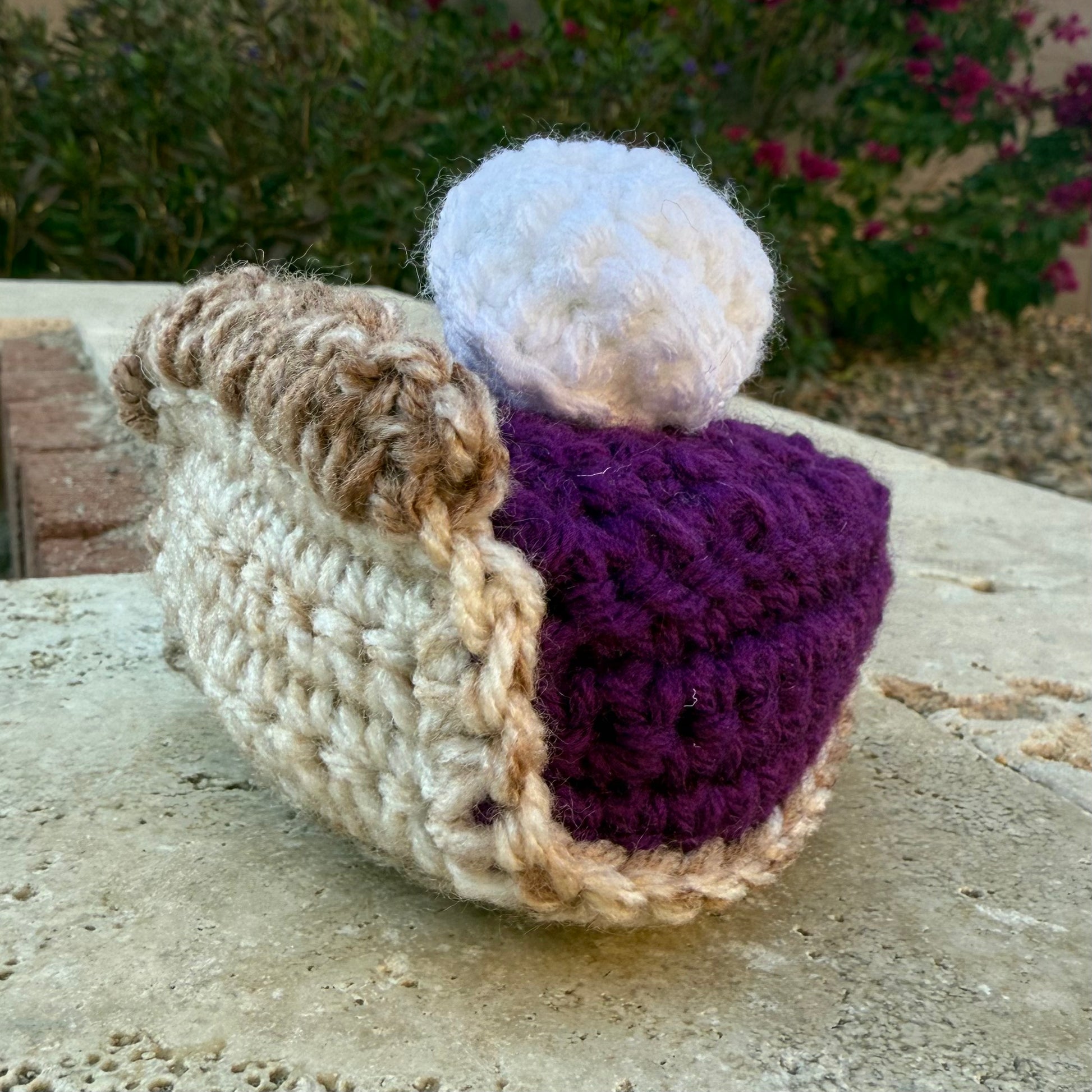 Indulge in a risk-taking adventure with our crochet Blackberry Cobbler! Featuring a handmade cookie dough crust and juicy blackberries carefully selected by Mike. Topped with a heavenly dollop of fake cool whip and made with love. This kawaii-style happy pie slice will satisfy your cravings and bring a bold burst of flavor to your home decor!
