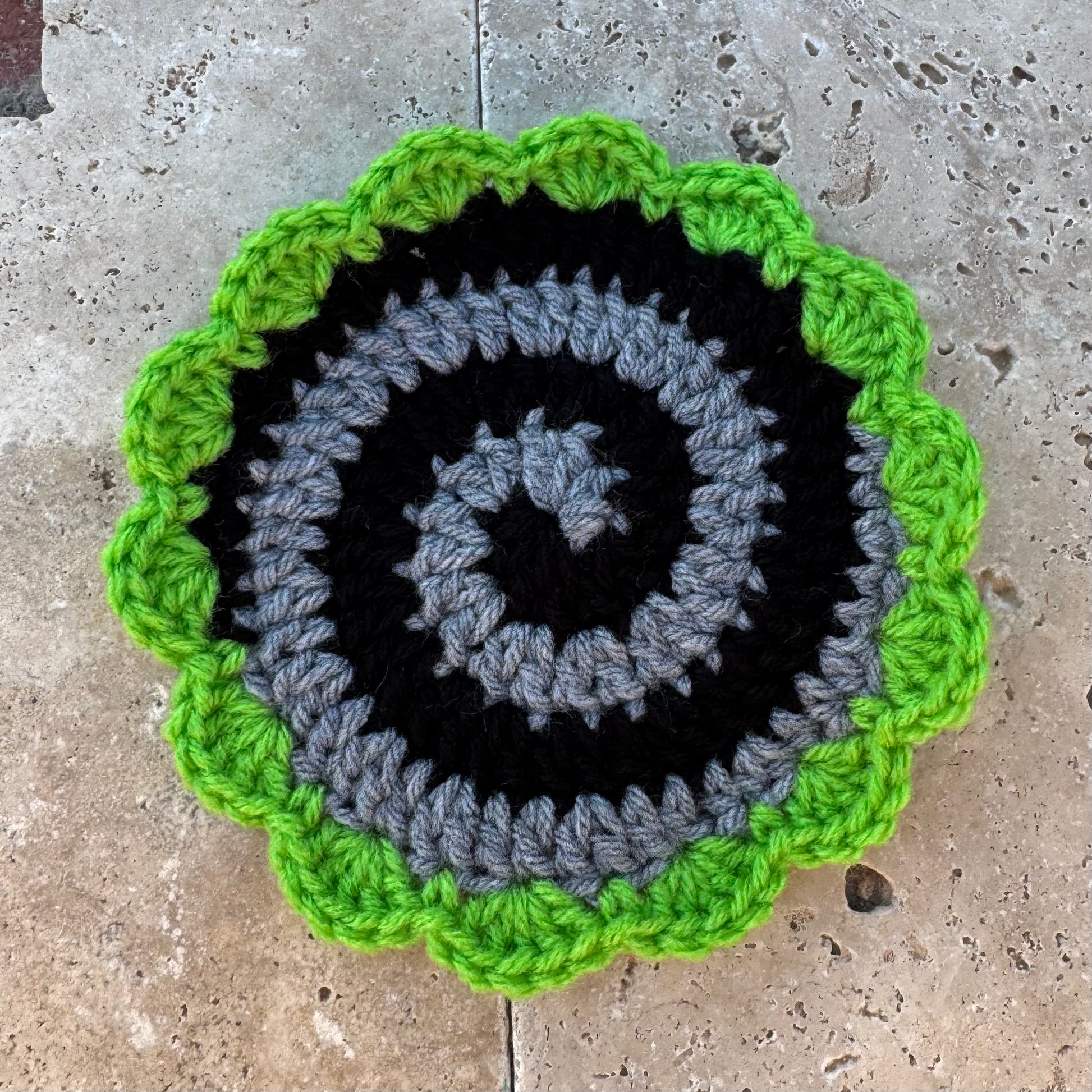Mike hand crochets these coasters. They are about 5" in diameter. However, they are all slightly different. You will get the one in this photo! Ready to ship!! No returns, made with love!